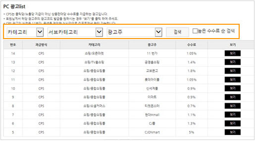 현재 진행 중인 광고 리스트 중에 매체사 회원께서는 카테고리, 과금 방식, 광고주명, 높은 수수료 순 등으로 원하는 광고 리스트를 검색 할 수 있습니다.