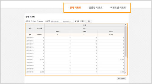 전체, 상품(과금방식)별, 머천트별 리포트 확인이 가능하며,